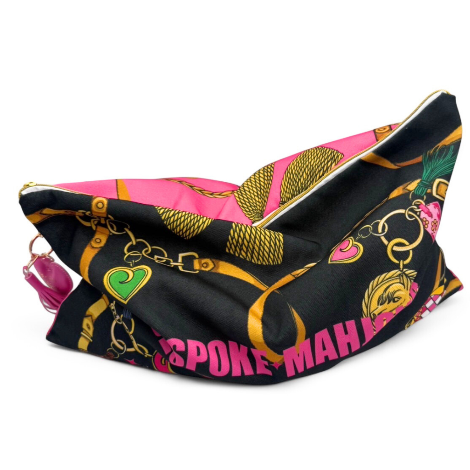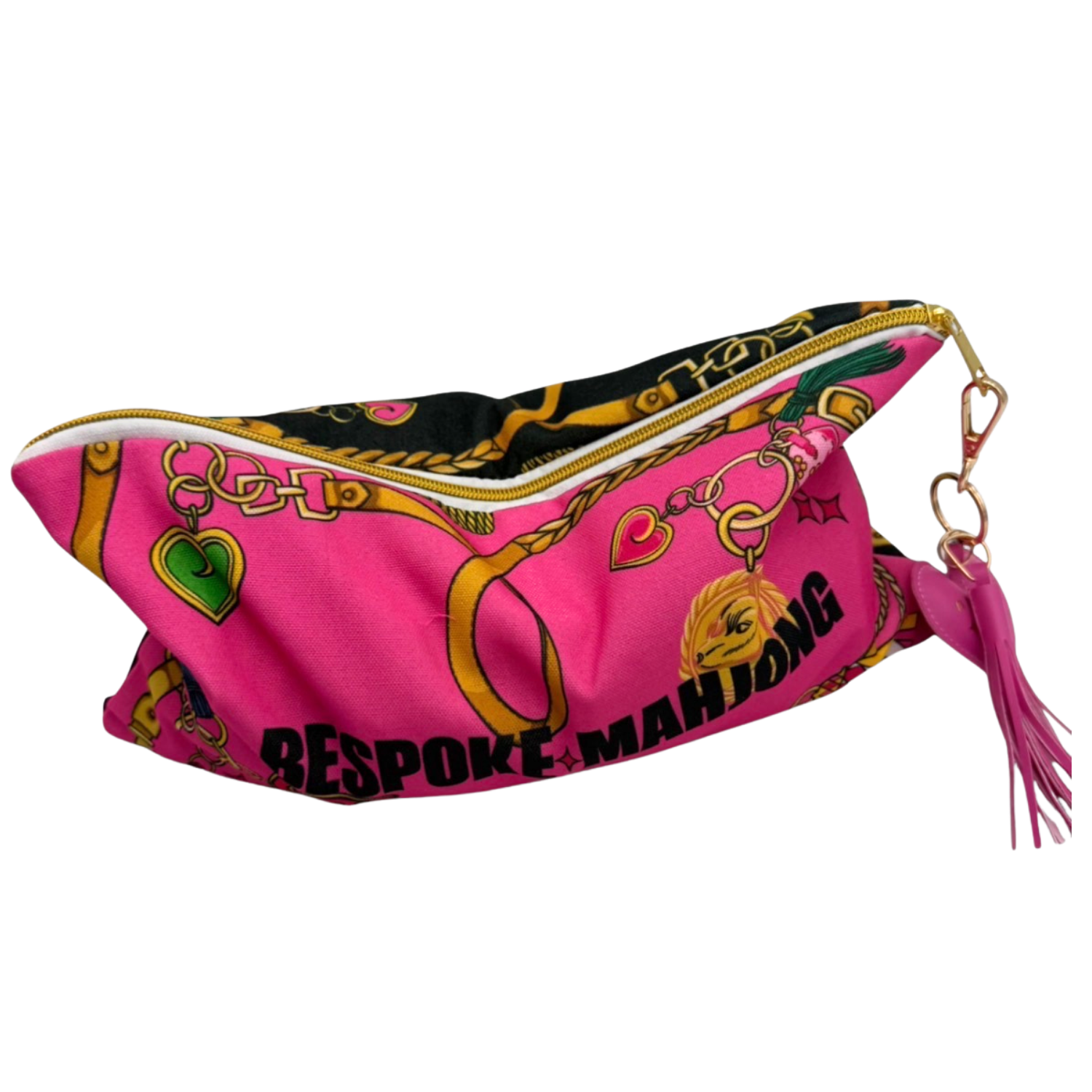 Bespoke Mahjong canvas tile bag designed to celebrate the Year of the Horse and match our collection but can be used to store any of your favorite traditional sized tiles. Includes a Bespoke Mahjong Puffy Heart Zipper Pull Keychain. Design is printed on each side of bag, one side in black, one side in hot pink.