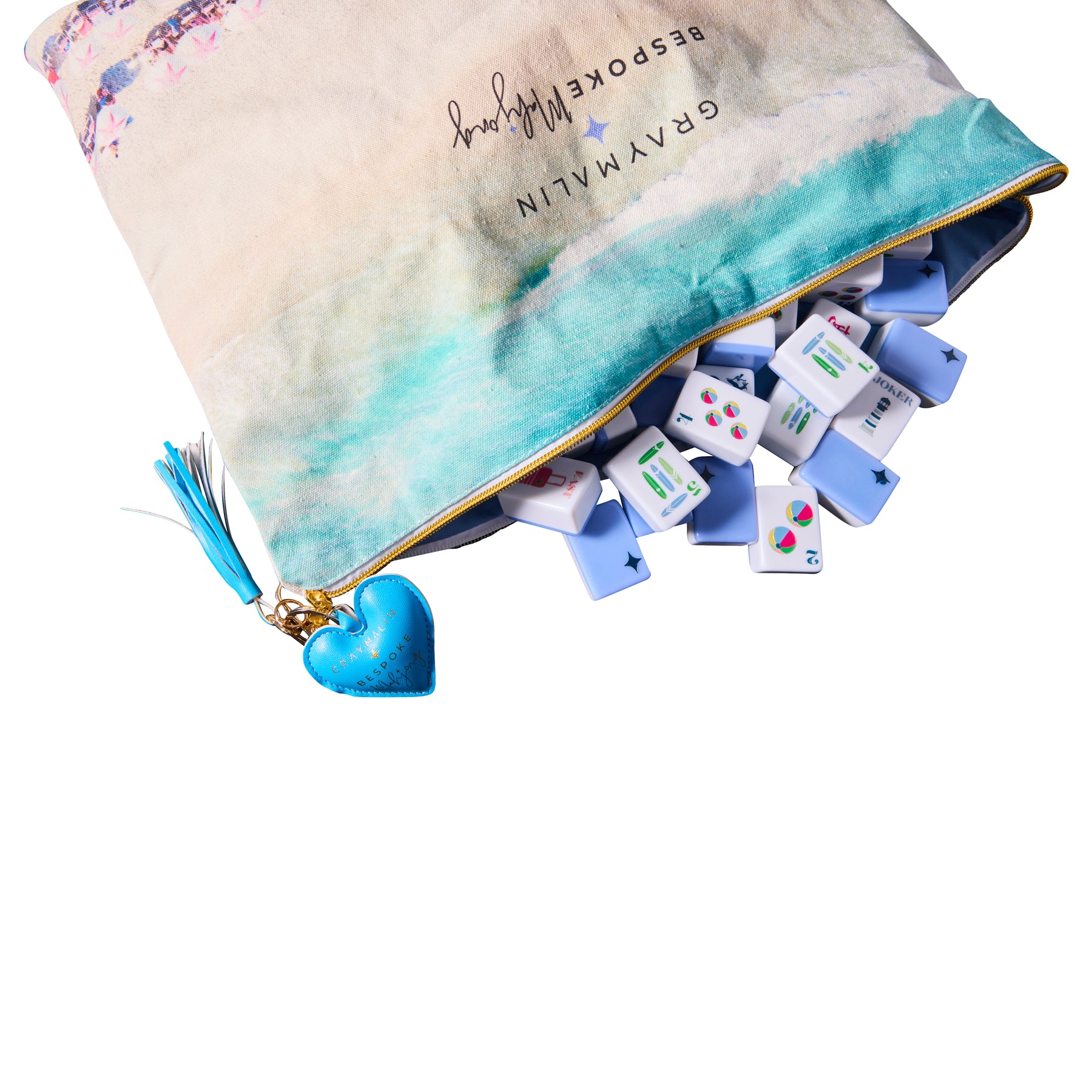 It's Here! The Bespoke X Gray Malin Collab. Meet our Mega XL Beauties. Bright White backs and Cabana Blue fronts: where beach balls replace Dots, longboards stand in for Bams, and Winds are packed up as chic little suitcases. Designed in Gray Malin’s signature color palette, these tiles turn every hand into a holiday. Equal parts playful and glamorous, they bring the beach to your game table—no sand in your shoes required.