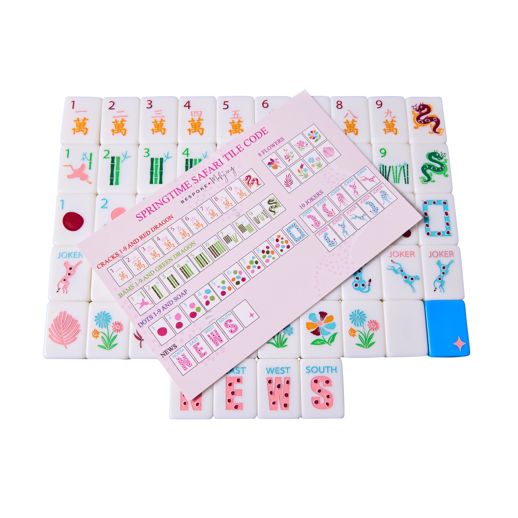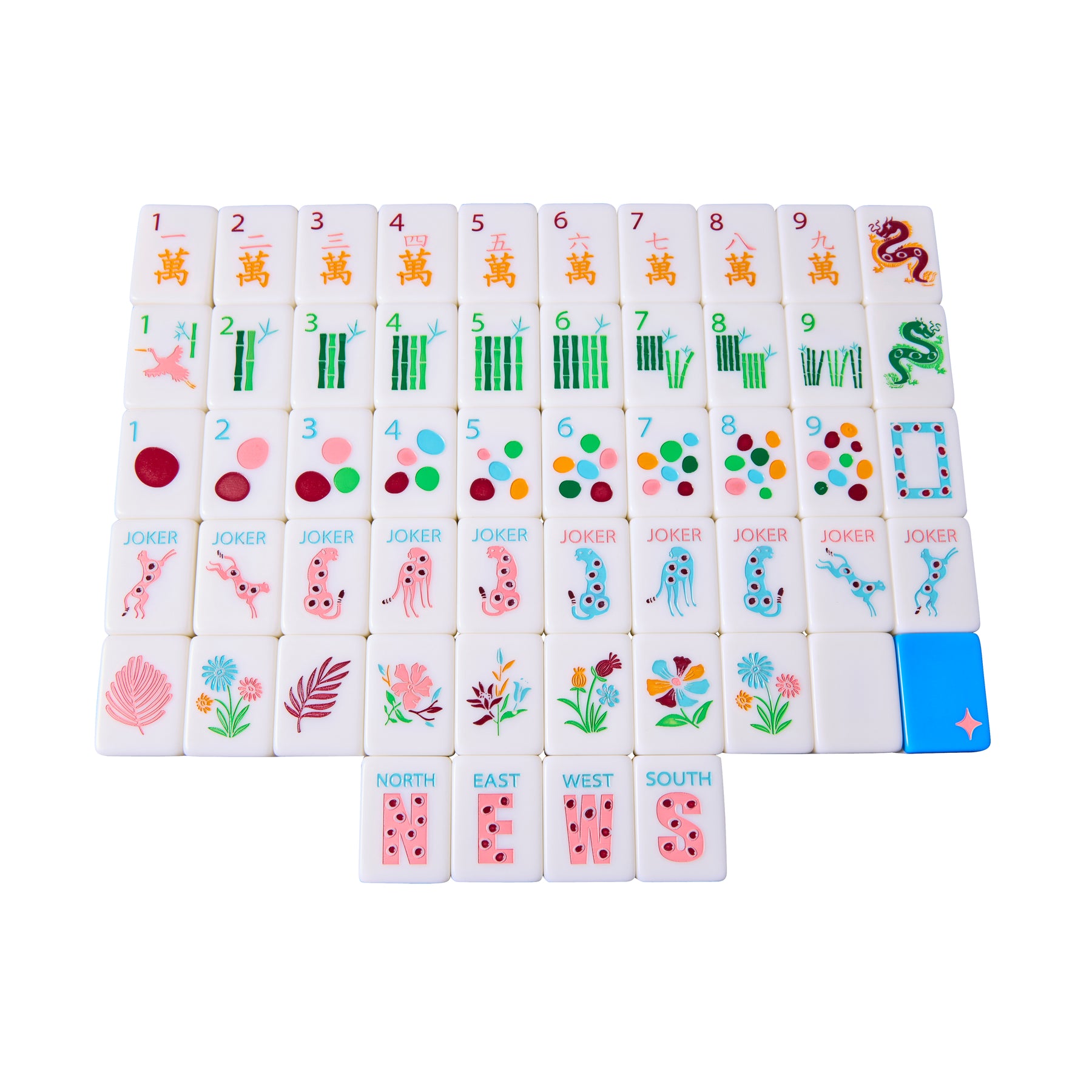 Tiles include: 160 Acrylic Tiles; 1-9 Bams, Craks, and Dots (4 of each) = 108; NEWS (4 of each)= 16; Red, Green, and White Dragons (4 of each) = 12; Flowers = 8; Jokers = 10; Blanks = 6.