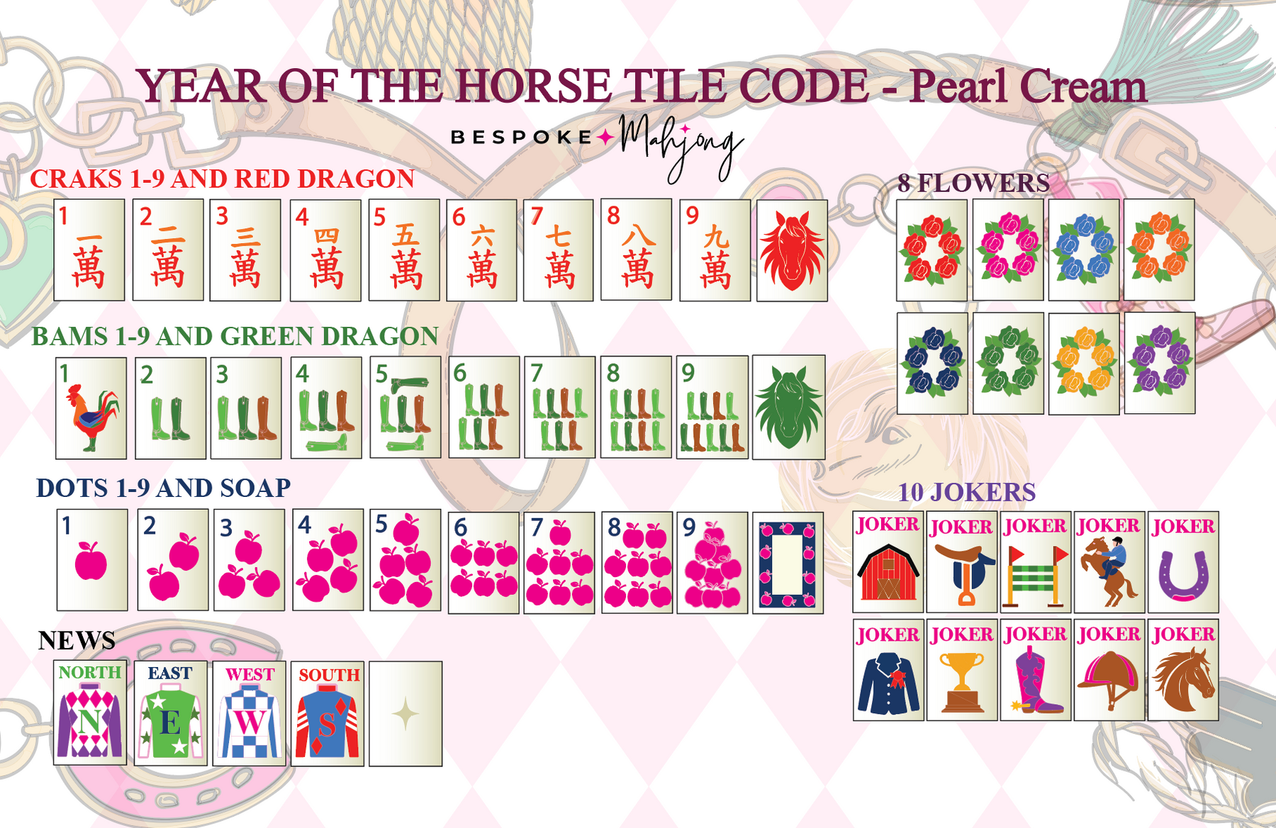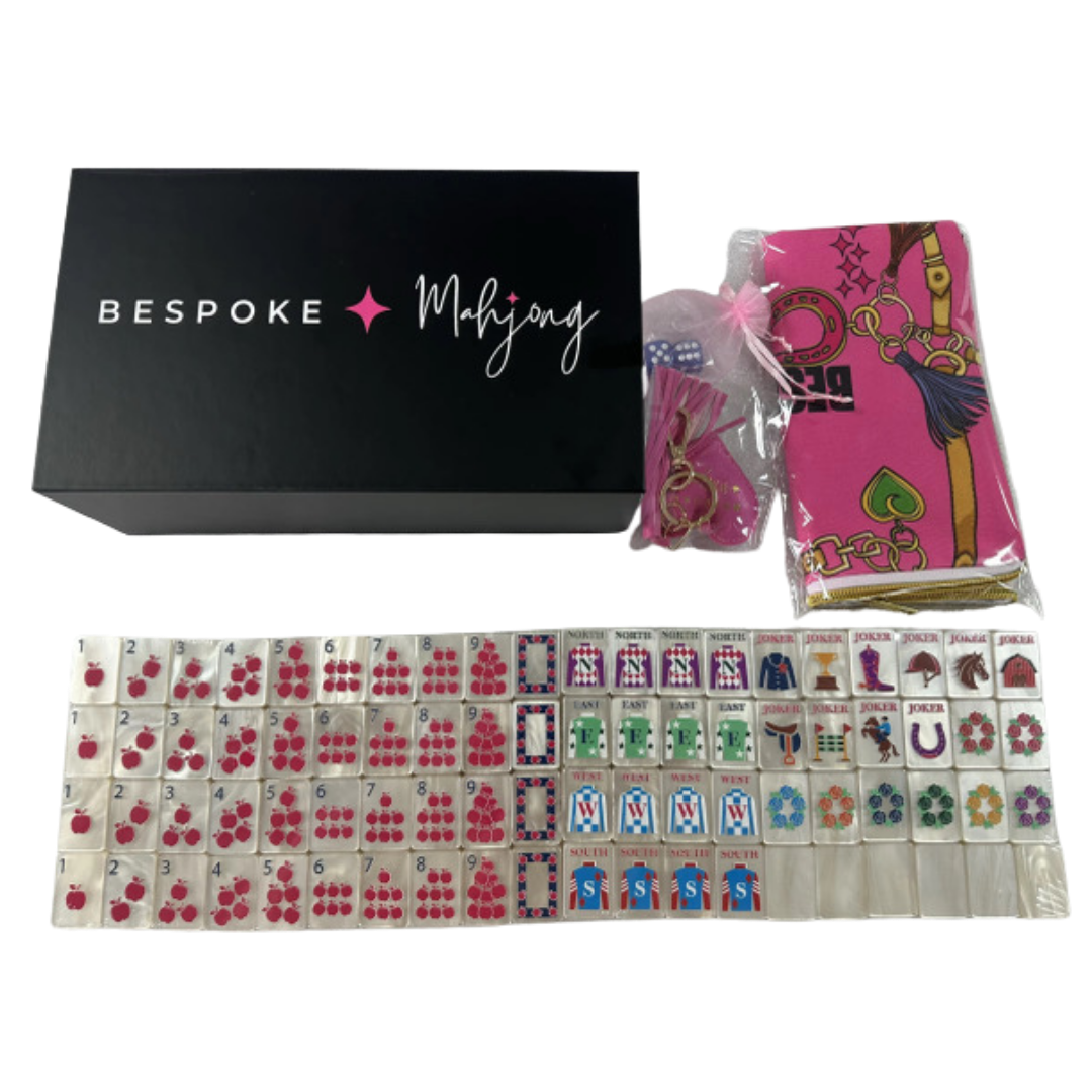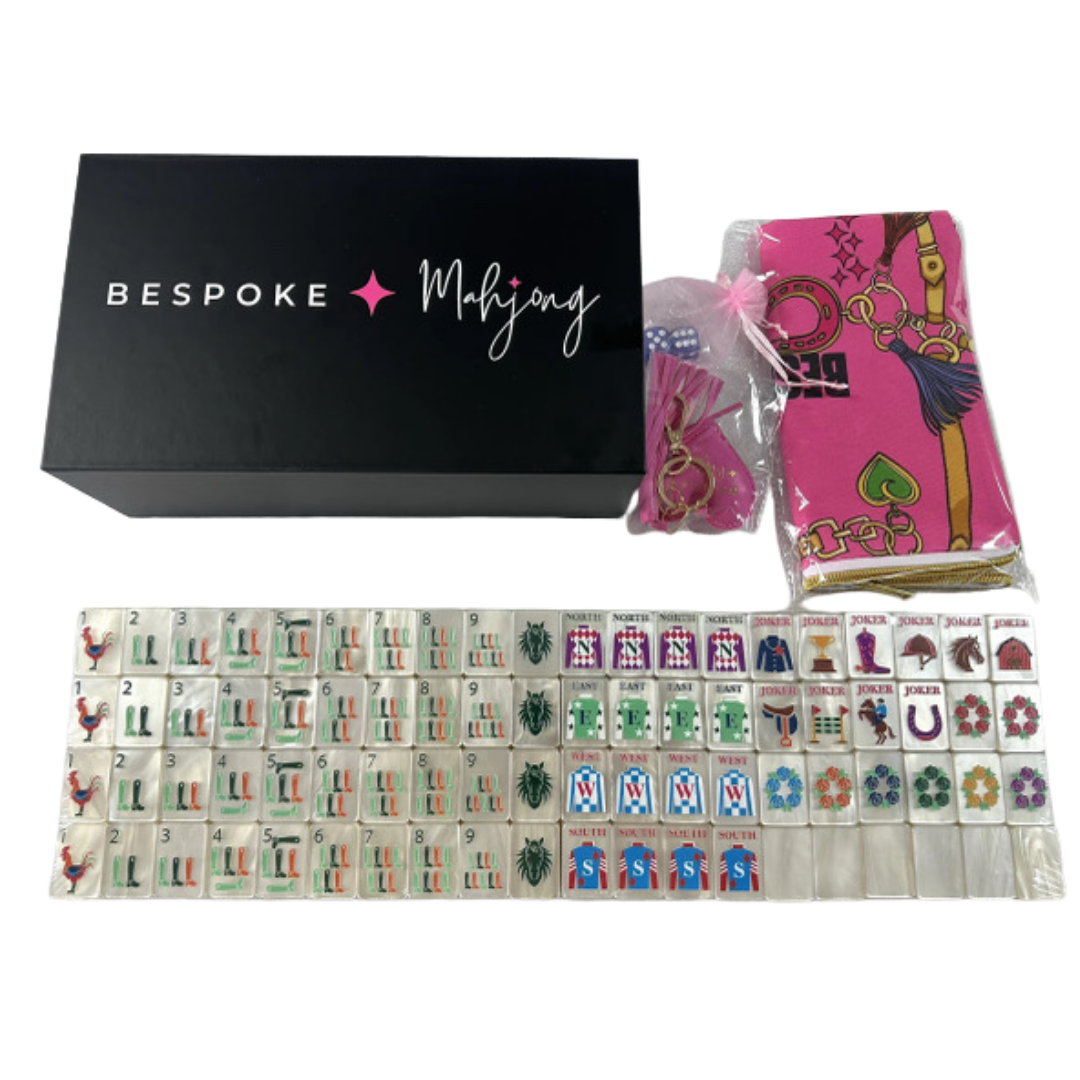 The Year of the Horse – Pearl Cream mahjong tiles feature a soft pearlescent cream base tile with elegant equestrian-inspired artwork, blending classic with a fresh, modern aesthetic. Horses, riding gear, apples, florals, and jockey silks create a playful yet refined set that feels both luxurious and whimsical and honors The Year of the Horse.