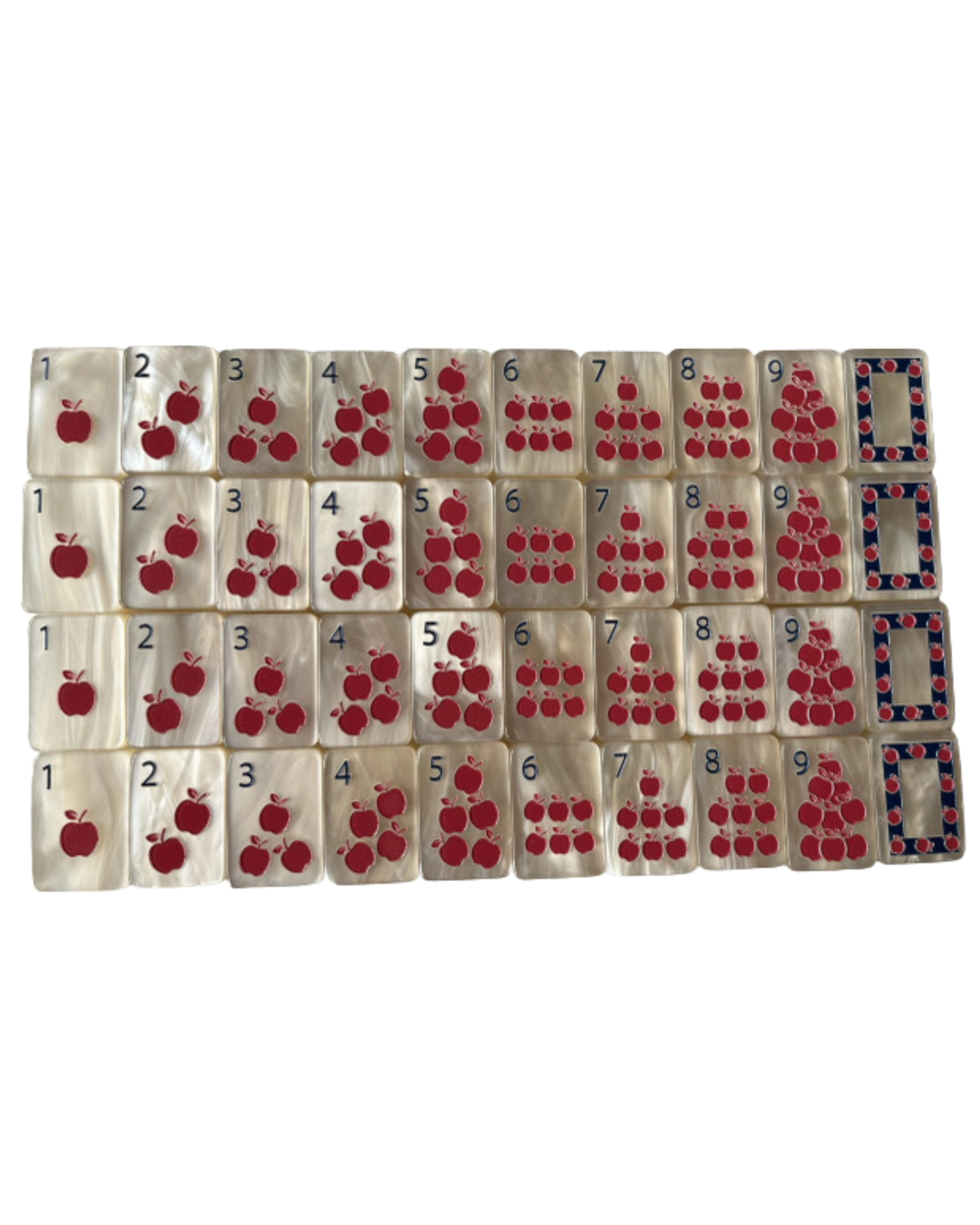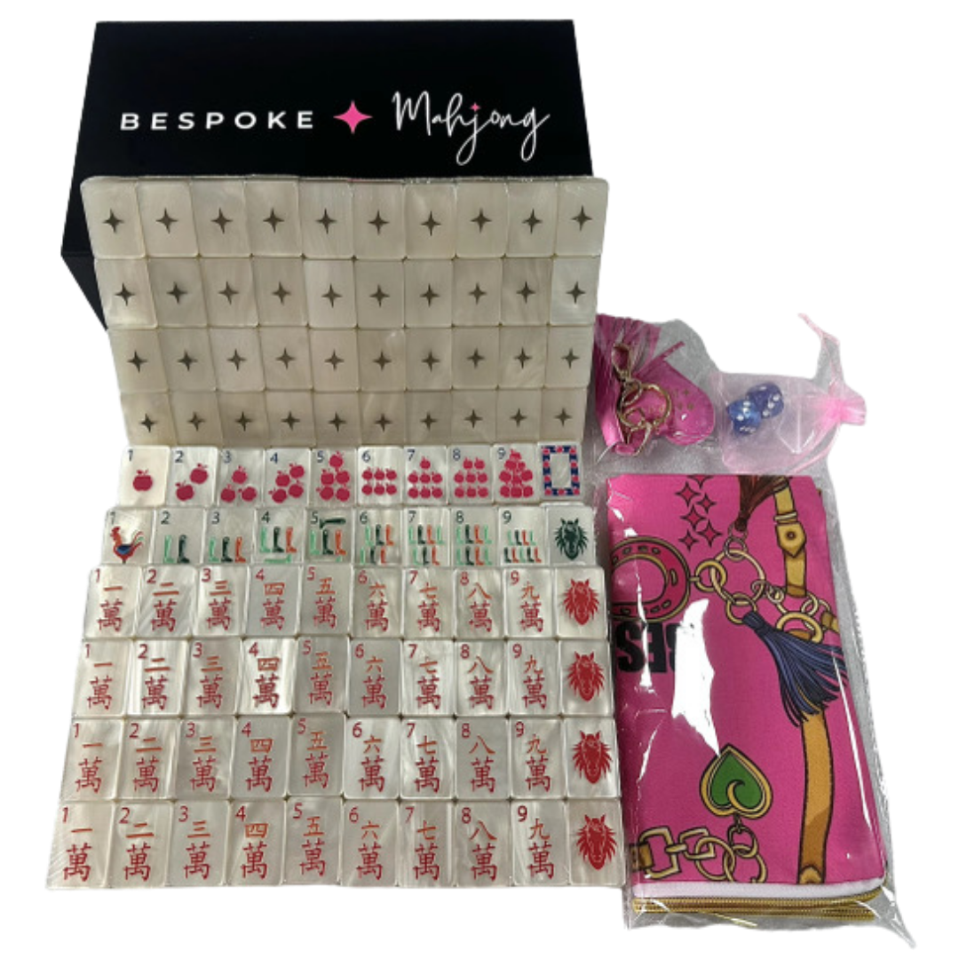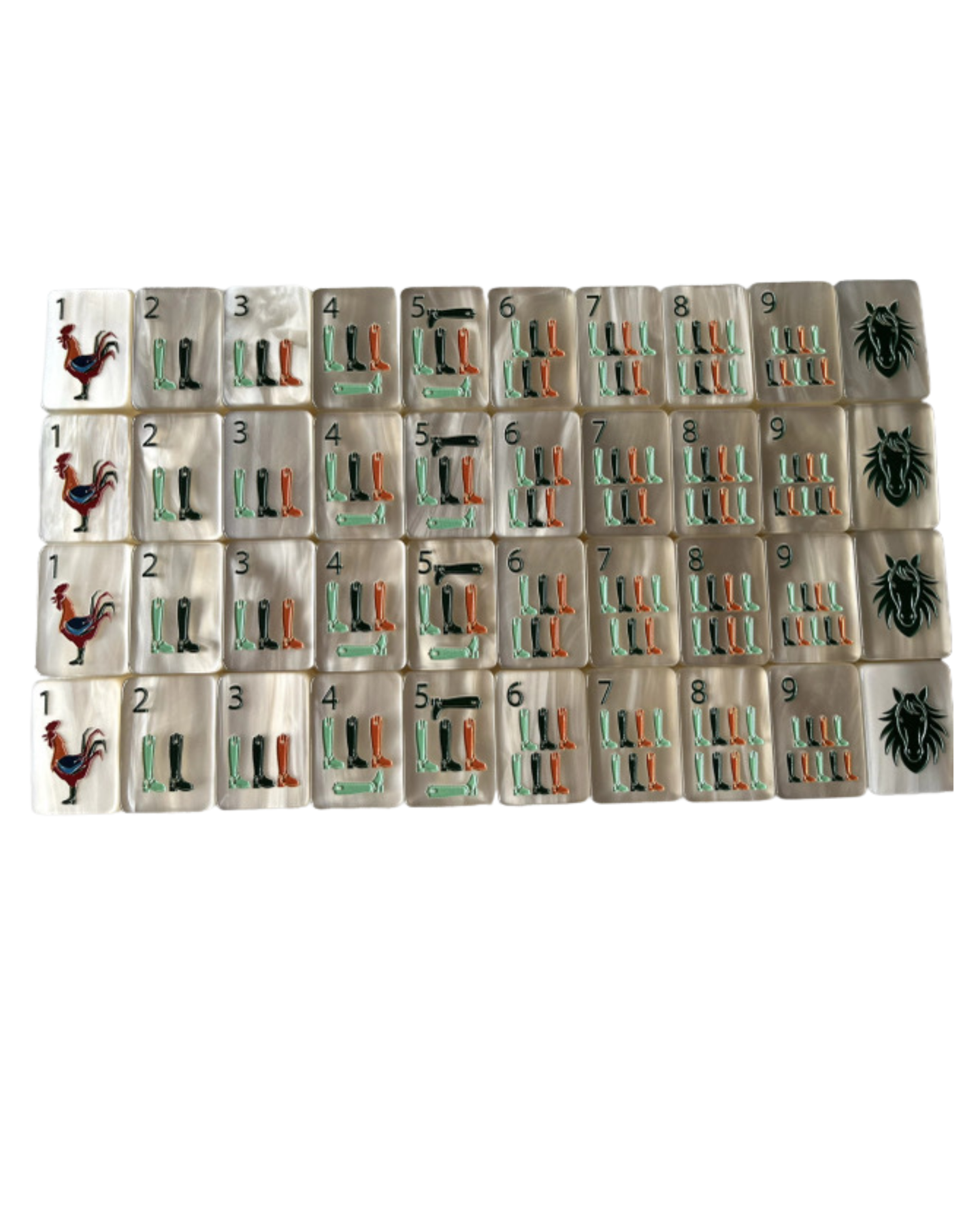 The Year of the Horse – Pearl Cream mahjong tiles feature a soft pearlescent cream base tile with elegant equestrian-inspired artwork, blending classic with a fresh, modern aesthetic. Horses, riding gear, apples, florals, and jockey silks create a playful yet refined set that feels both luxurious and whimsical and honors The Year of the Horse.