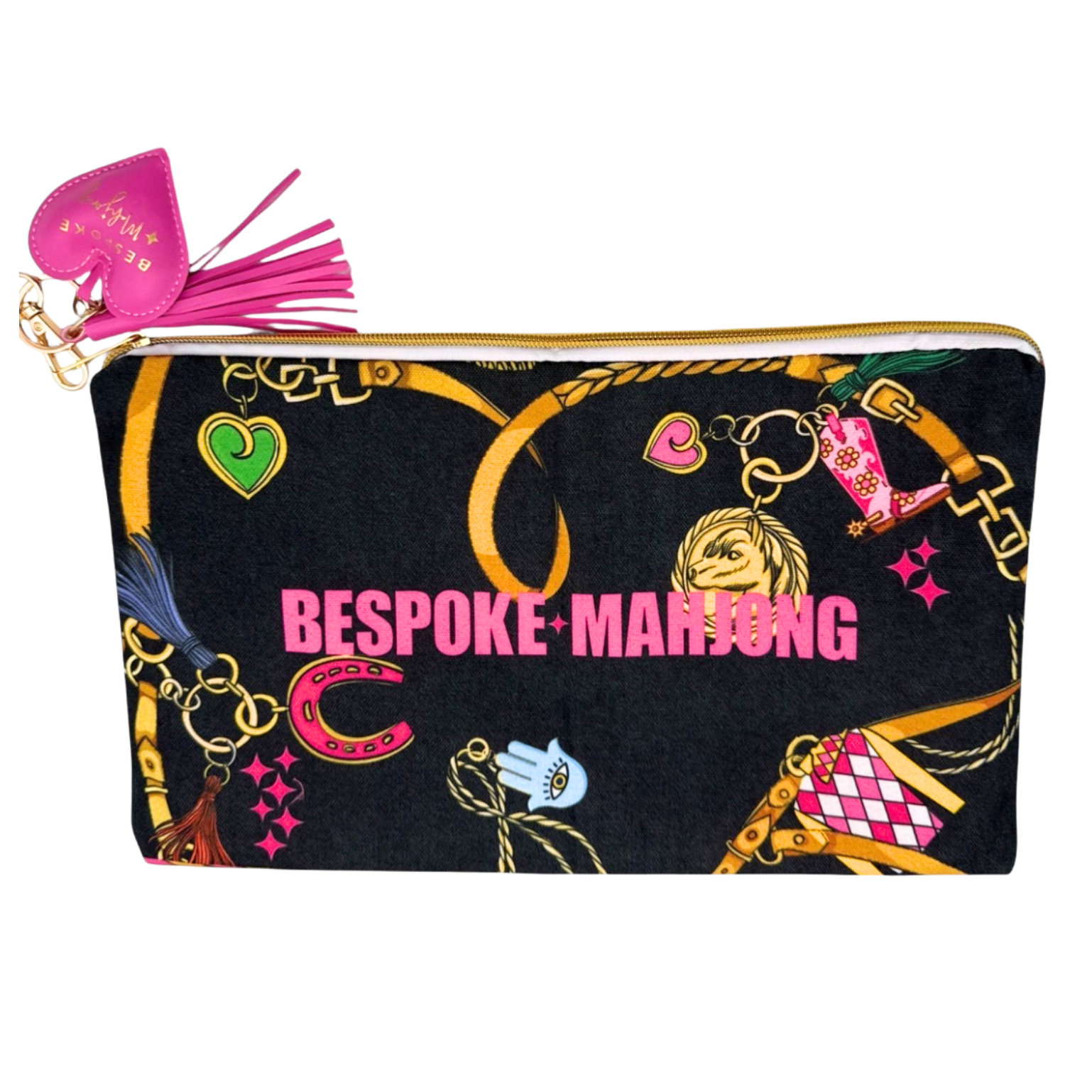 Tile set includes a matching canvas double-sided tile bag in hot pink and black, puffy heart Bespoke zipper pull, and dice.