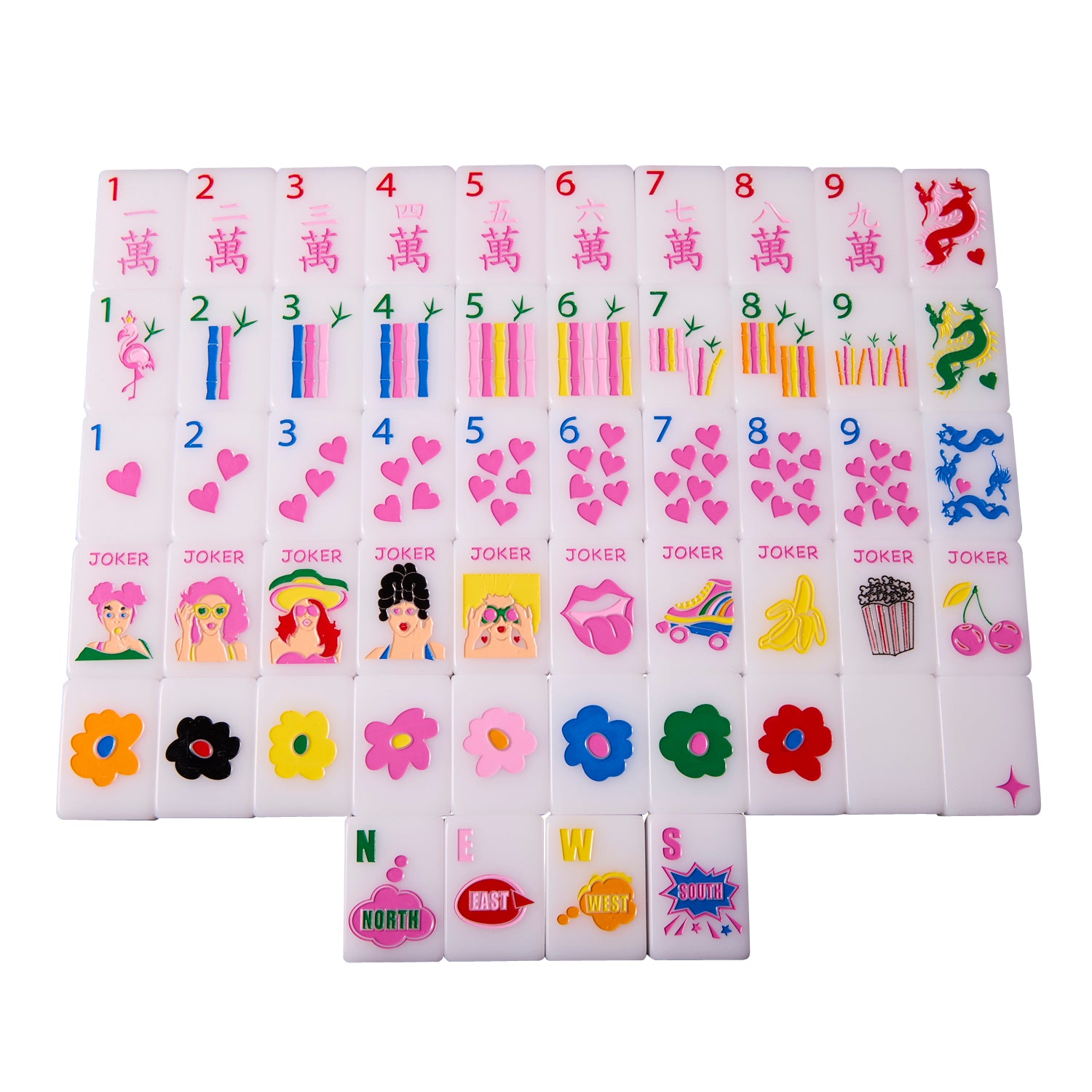 This Pop Divas Mahjong set is a burst of retro fun and playful energy! The Joker tiles bring serious diva vibes with cherries, roller skates, popcorn, and fabulous pop stars in oversized hats and bright hair. The dots/hearts is totally adorable with big, bold pink hearts, while the bamboo suit gets a chic makeover with a flamingo and rainbow-striped bamboo sticks. The craks are all decked out in neon red Chinese characters, and the dragon tiles are fierce, featuring vibrant green and pink dragons. To top it all off, the wind and flower tiles are sprinkled with cute speech bubbles and groovy flowers, making every tile pop against the punchy green background!