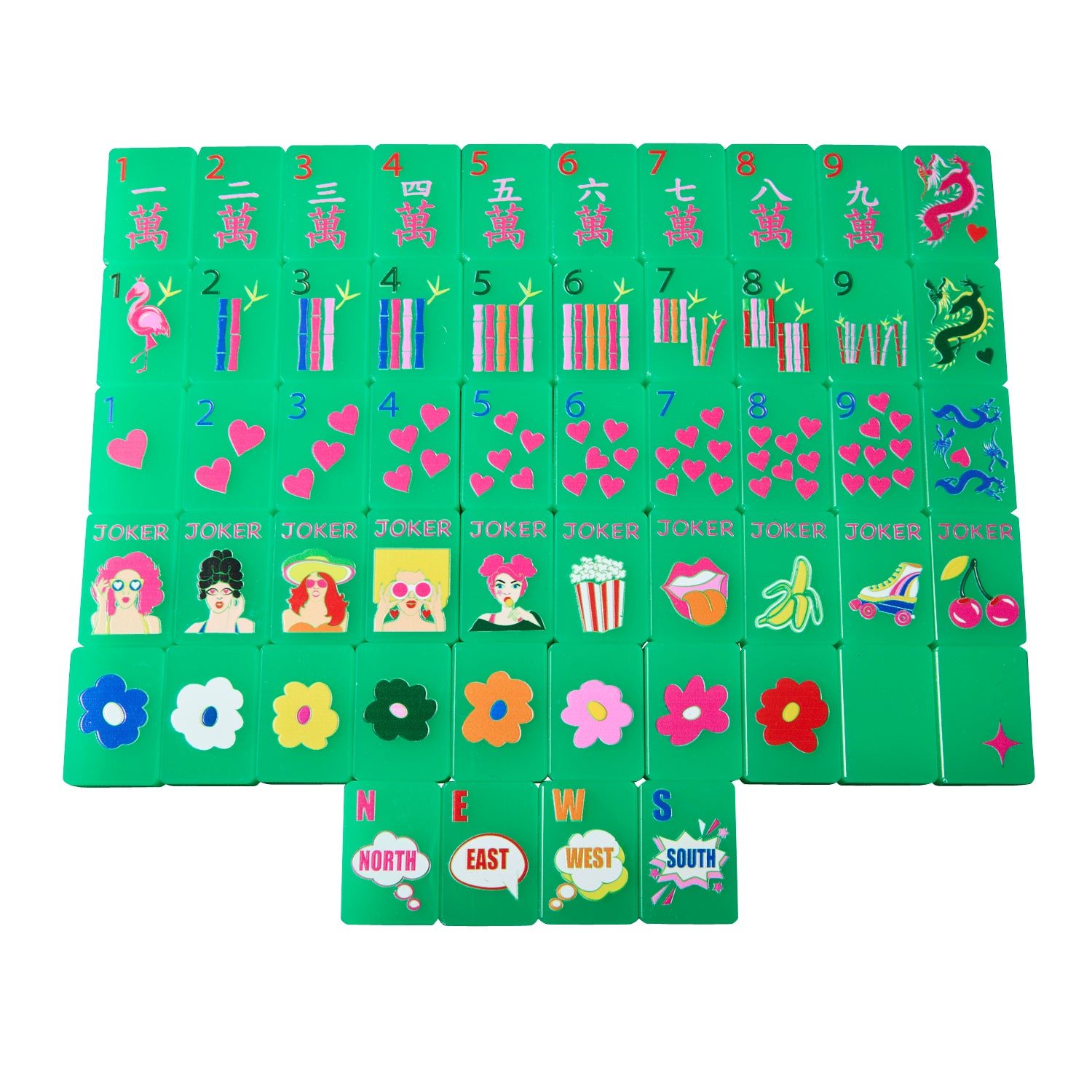 This Pop Divas Mahjong set is a burst of retro fun and playful energy! The Joker tiles bring serious diva vibes with cherries, roller skates, popcorn, and fabulous pop stars in oversized hats and bright hair. The dots/hearts is totally adorable with big, bold pink hearts, while the bamboo suit gets a chic makeover with a flamingo and rainbow-striped bamboo sticks. The craks are all decked out in neon red Chinese characters, and the dragon tiles are fierce, featuring vibrant green and pink dragons. To top it all off, the wind and flower tiles are sprinkled with cute speech bubbles and groovy flowers, making every tile pop against the punchy green background!