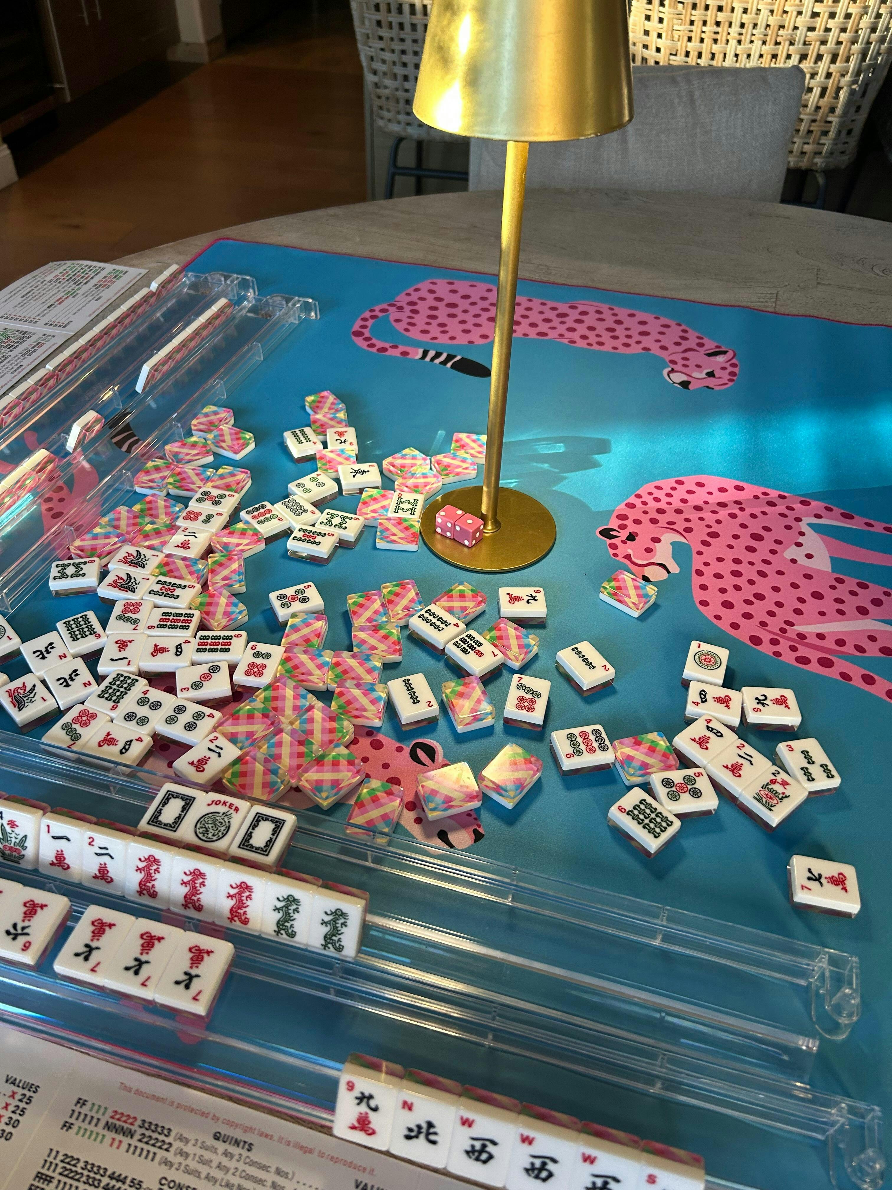 Sassy, sophisticated, and fun! As part of our Springtime Safari Collection, this mat in Preppy Pink with leaping pink leopards will elevate your mahjong game to a whole new level! Lilac Blue and border stitching in matching Leopard Pink. The non-slip surface will ensure your tiles stay in place.