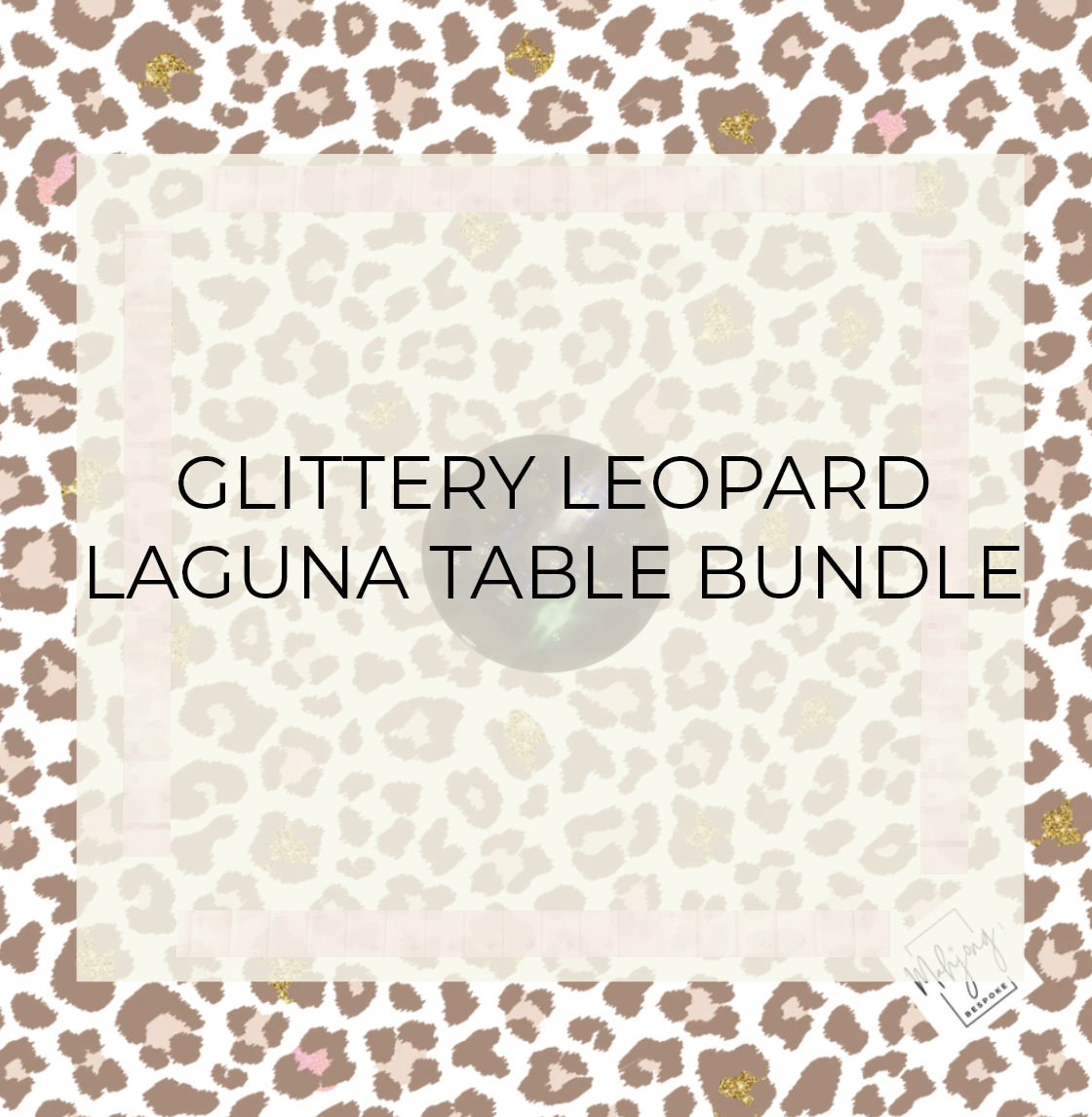 - The Laguna Table in Glittery Leopard Design with pedestal folding base in either black base or white base. This base allows for either permanent set-up or folds to store or wheel to another location.