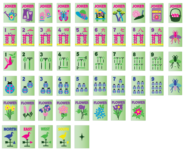 Tiles include: 160 Acrylic Tiles; 1-9 Bams, Craks, and Dots (4 of each) = 108; NEWS (4 of each)= 16; Red, Green, and White Dragons (4 of each) = 12; Flowers = 8; Jokers = 10; Blanks = 6.