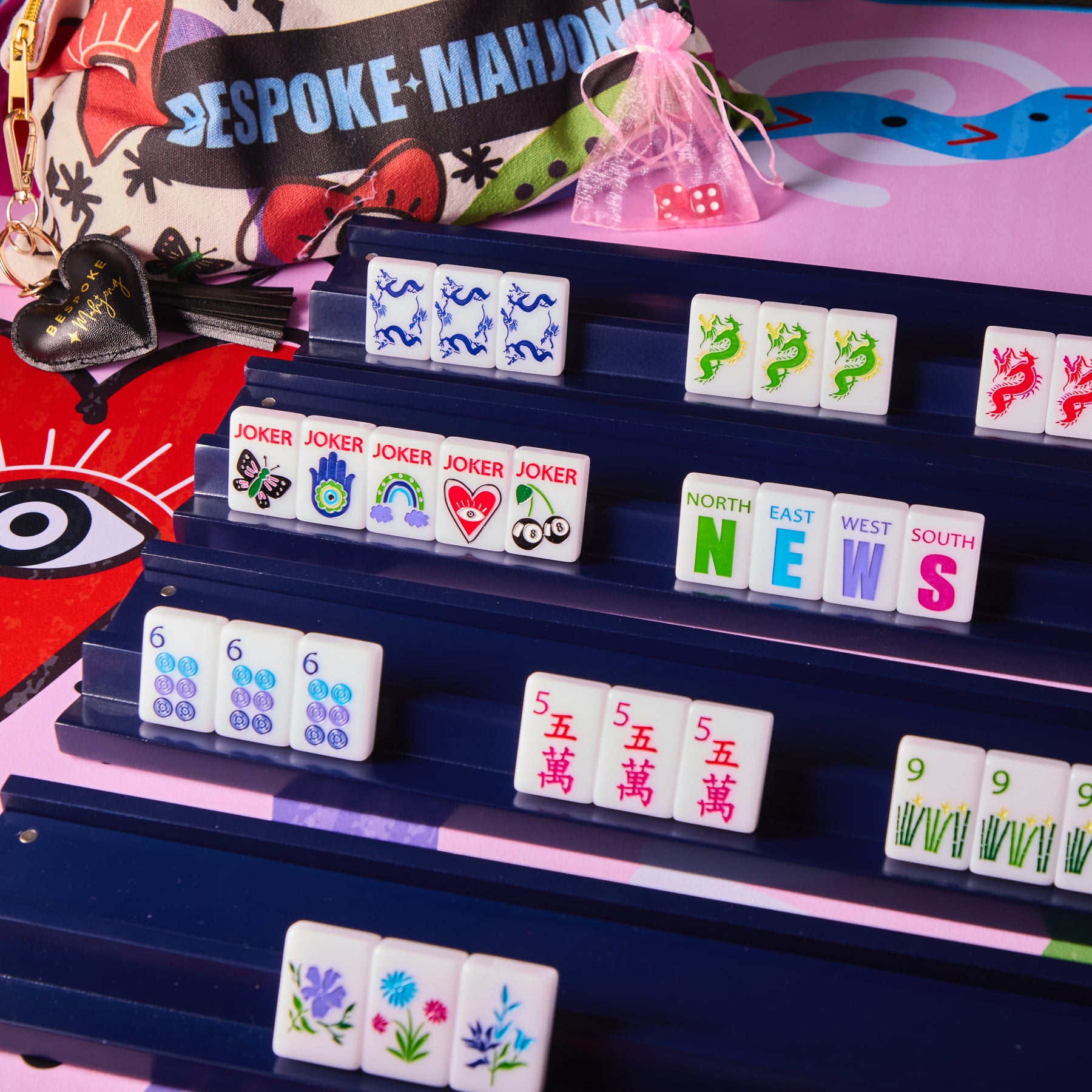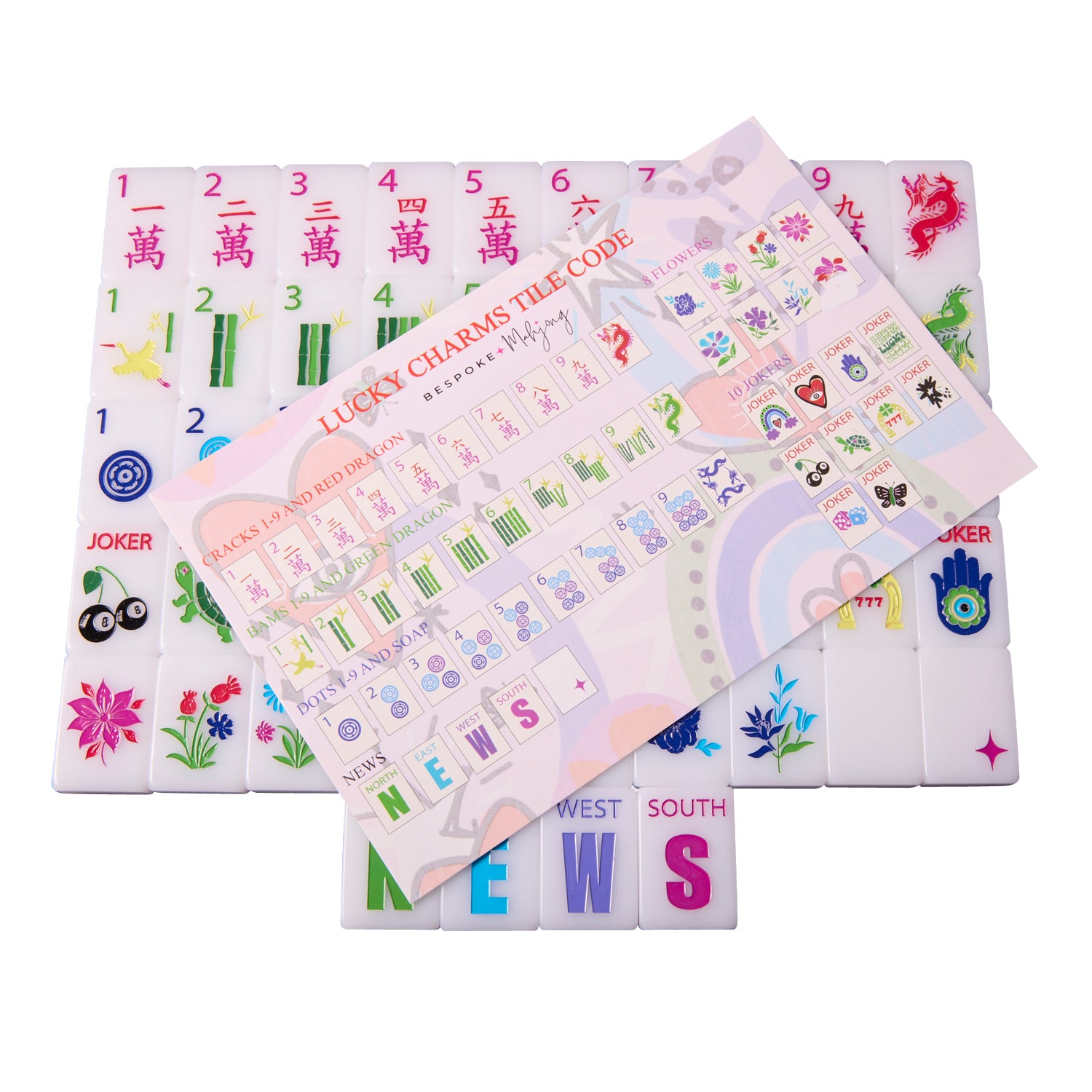 Introducing the Bespoke Mahjong Lucky Charms! This Mahjong set is bursting with personality and vibrant colors! The Joker tiles is a playful mix of quirky designs, featuring everything from hearts and eyes to turtles, butterflies, and other fun symbols, almost like lucky charms meant to bring good fortune to your game. The rest of the set sticks to Mahjong tradition but with a funky twist—the crak tiles flaunt bold red Chinese characters, the dot tiles have colorful swirls, and the bamboo tiles feature a cute little bird on the 1-bamboo tile and neat bamboo stalks for the others. A garden of flowers blooms in the corner, and the wind tiles are ready to blow in all directions—North, East, West, and South. Plus, those fierce dragon tiles add a dash of magic to the mix!