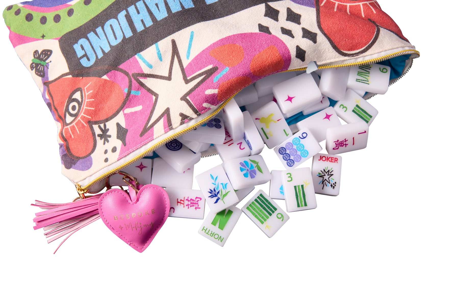 Tile set includes a matching canvas tile bag, puffy heart Bespoke zipper pull, and dice.