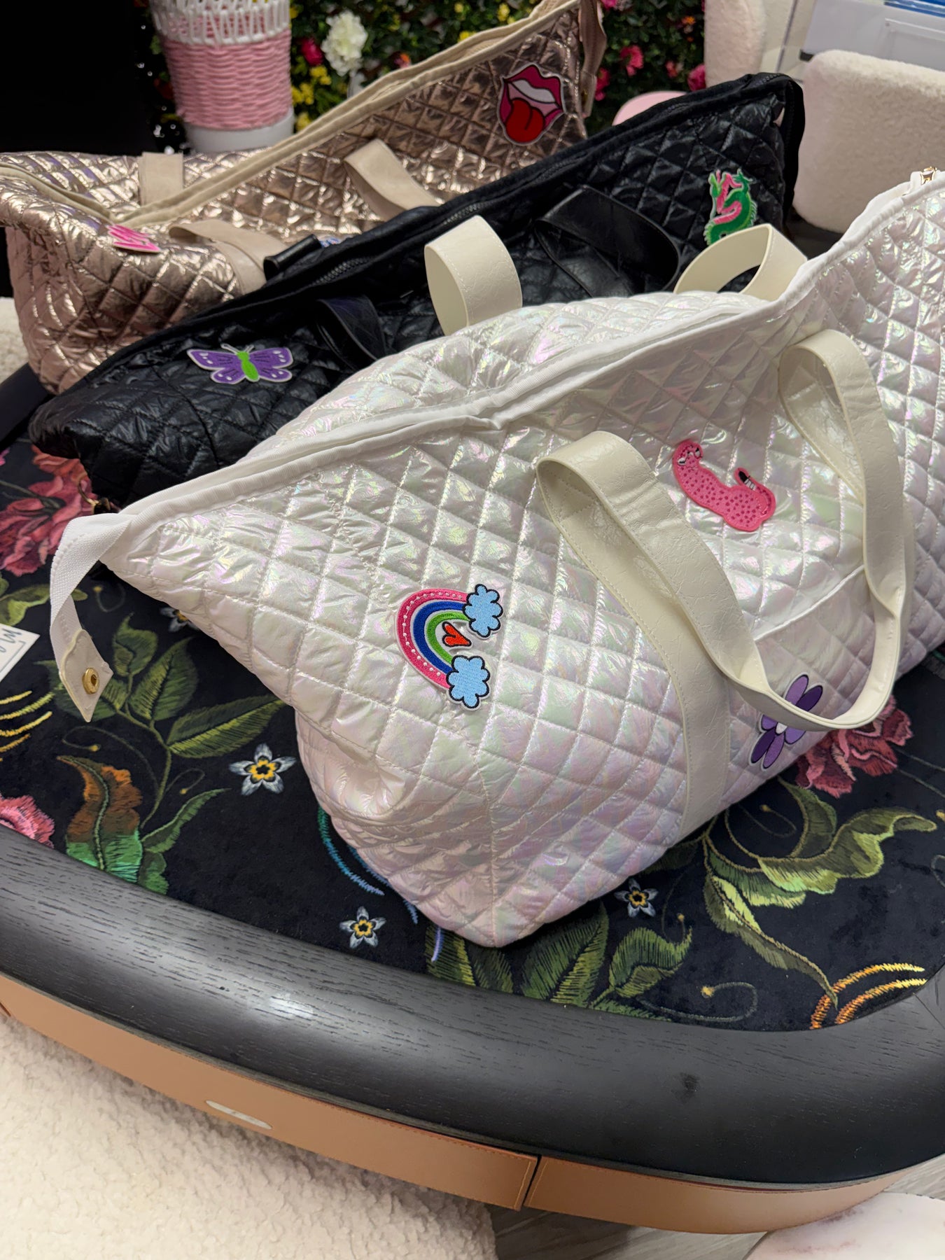Choose from three luxe finishes—Brushed Gold, Midnight Black, or Iridescent White—each featuring dual comfortable shoulder straps for easy carrying. And the best part? All in a perfectly coordinated design which includes the cutest Bespoke designed self adhesive patches for each bag. Tote arrives with no patches, allowing you to add as many or as little as you like.