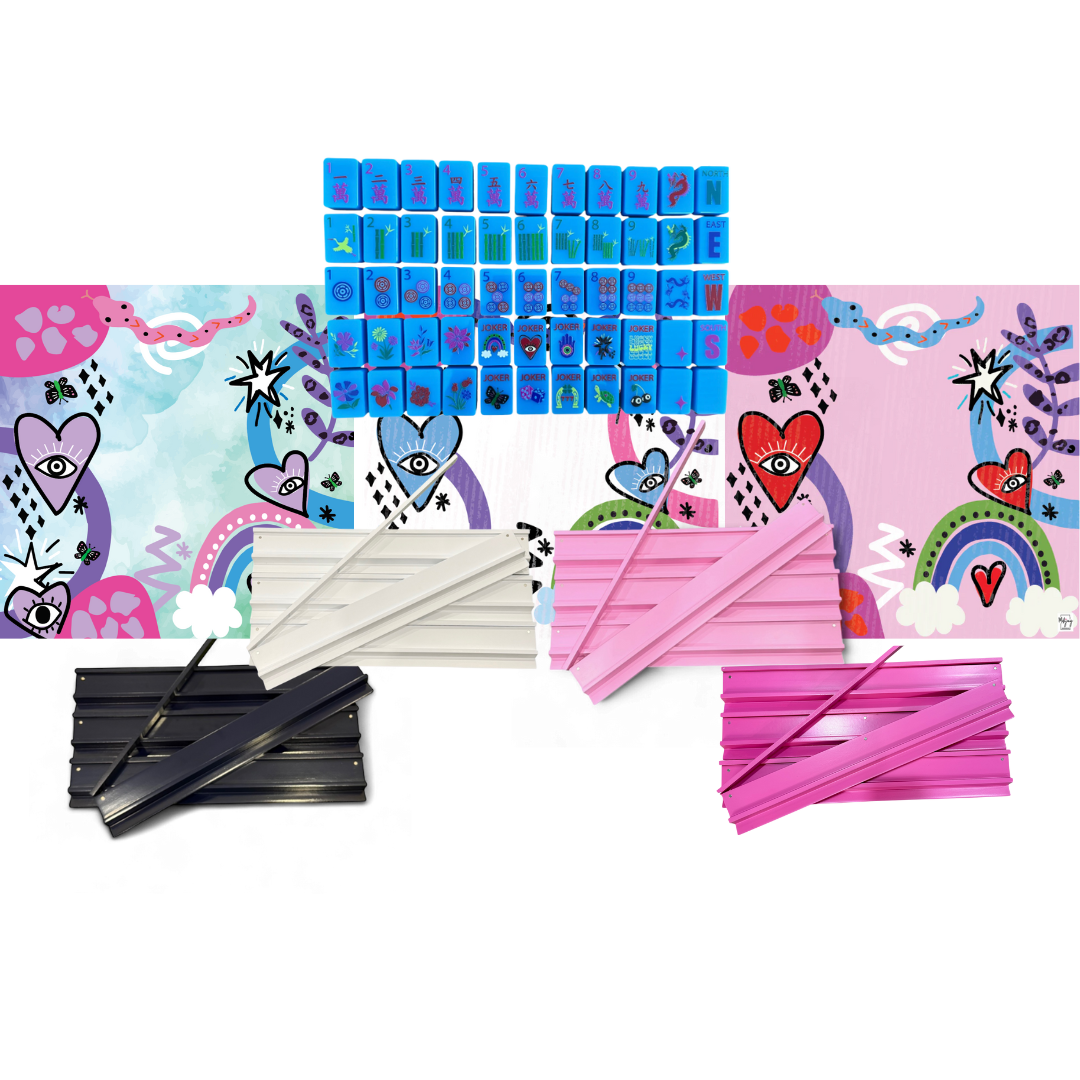 Elevate your gaming experience with The Bespoke Lucky Charms Kit in ELECTRIC BLUE tiles. The Electric Blue pops with our Lucky Charms Collection of Mats! This bundle of goodies includes tiles, racks, rack bag, game mat, tile bag, dice, and an acrylic display box for the tiles. Sure to make a perfect gift for any mahjong player!