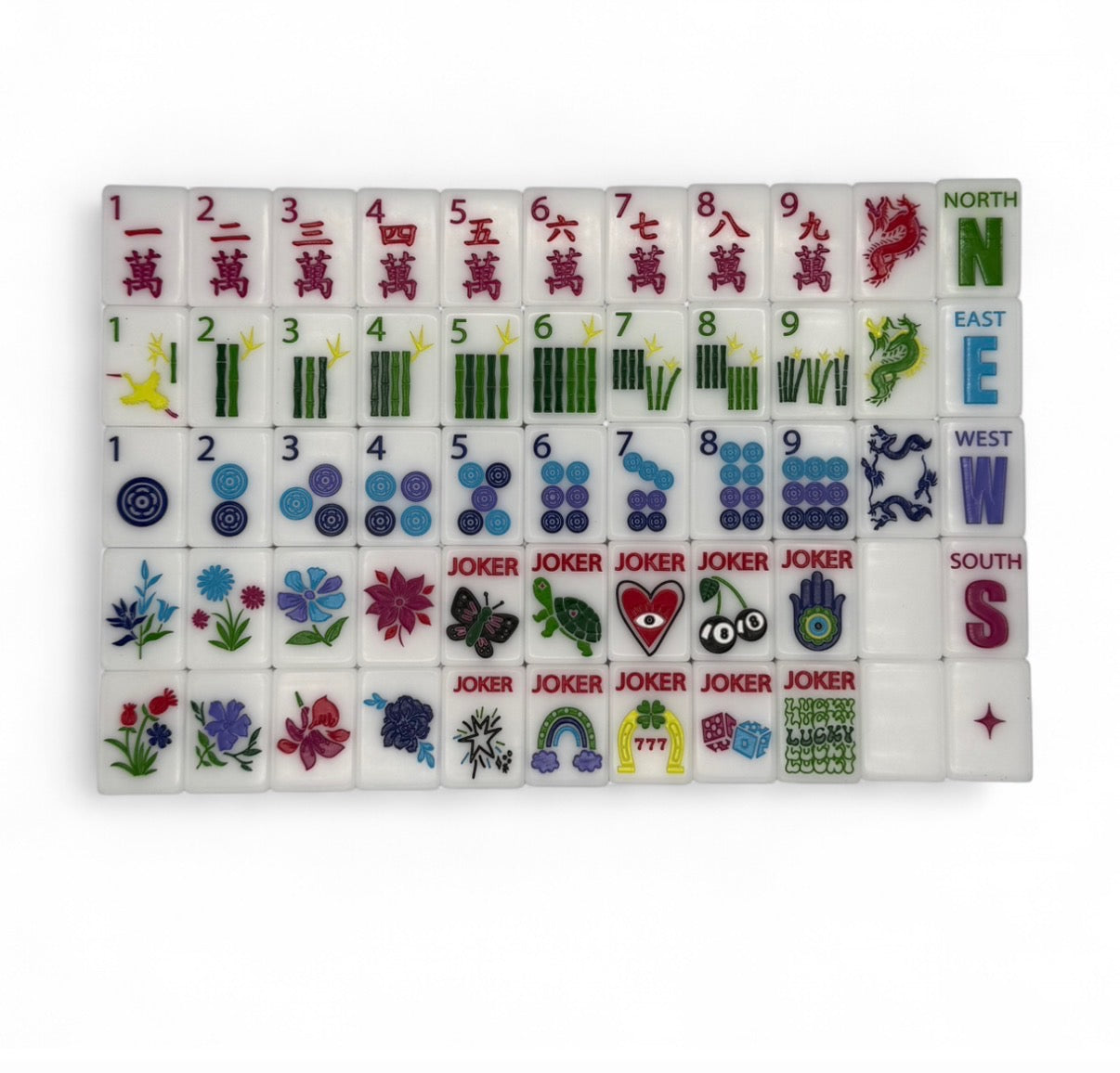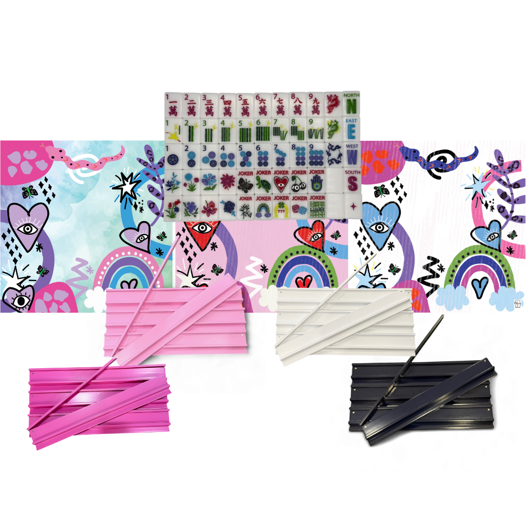 Elevate your gaming experience with The Bespoke Lucky Charms Kit in BRIGHT WHITE tiles. The Bright White pops with our Lucky Charms Collection of Mats! This bundle of goodies includes tiles, racks, rack bag, game mat, tile bag, dice, and an acrylic display box for the tiles. Sure to make a perfect gift for any mahjong player!