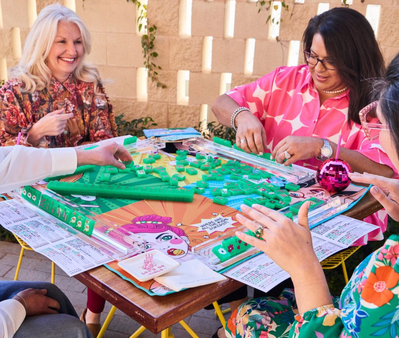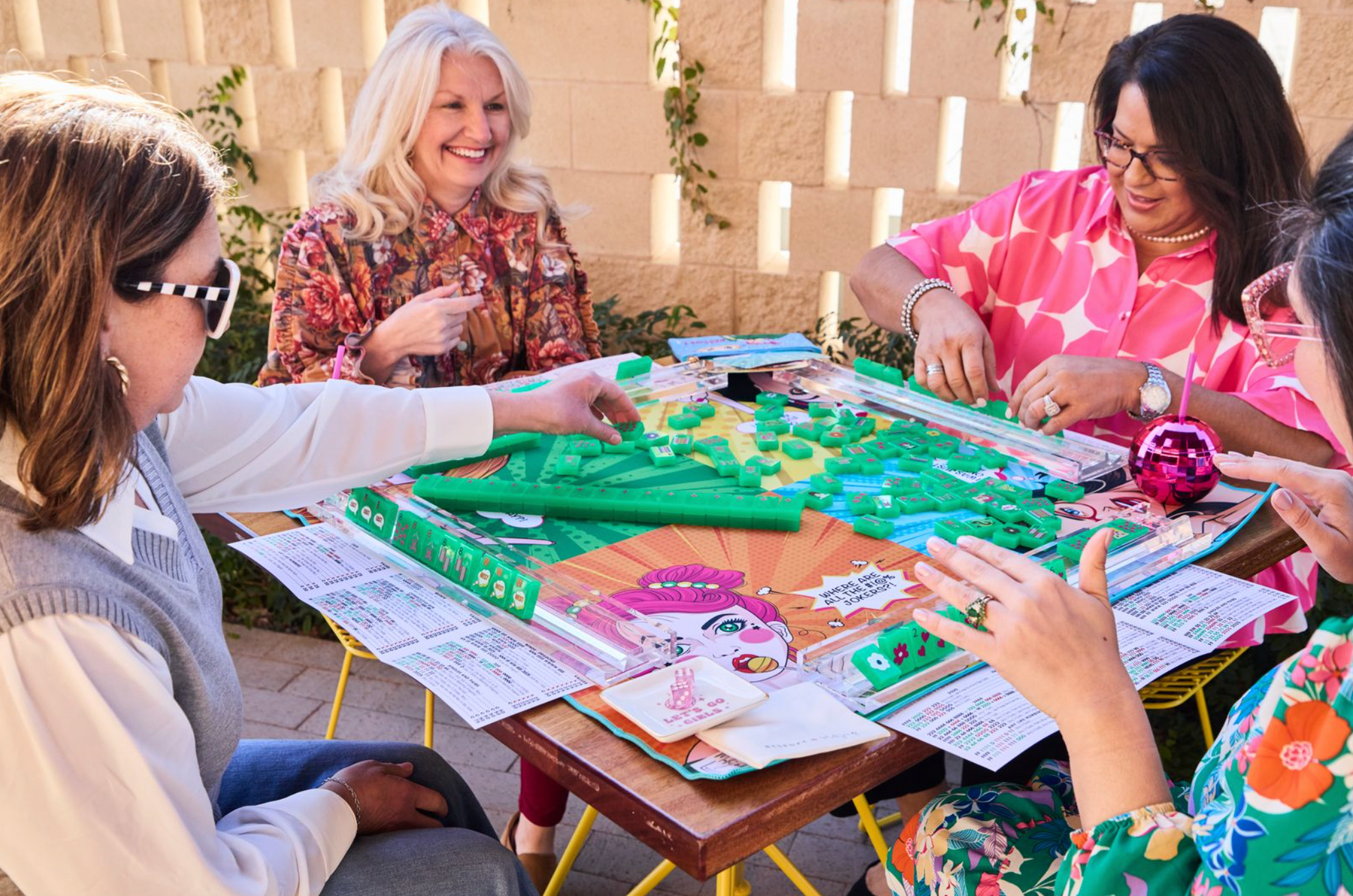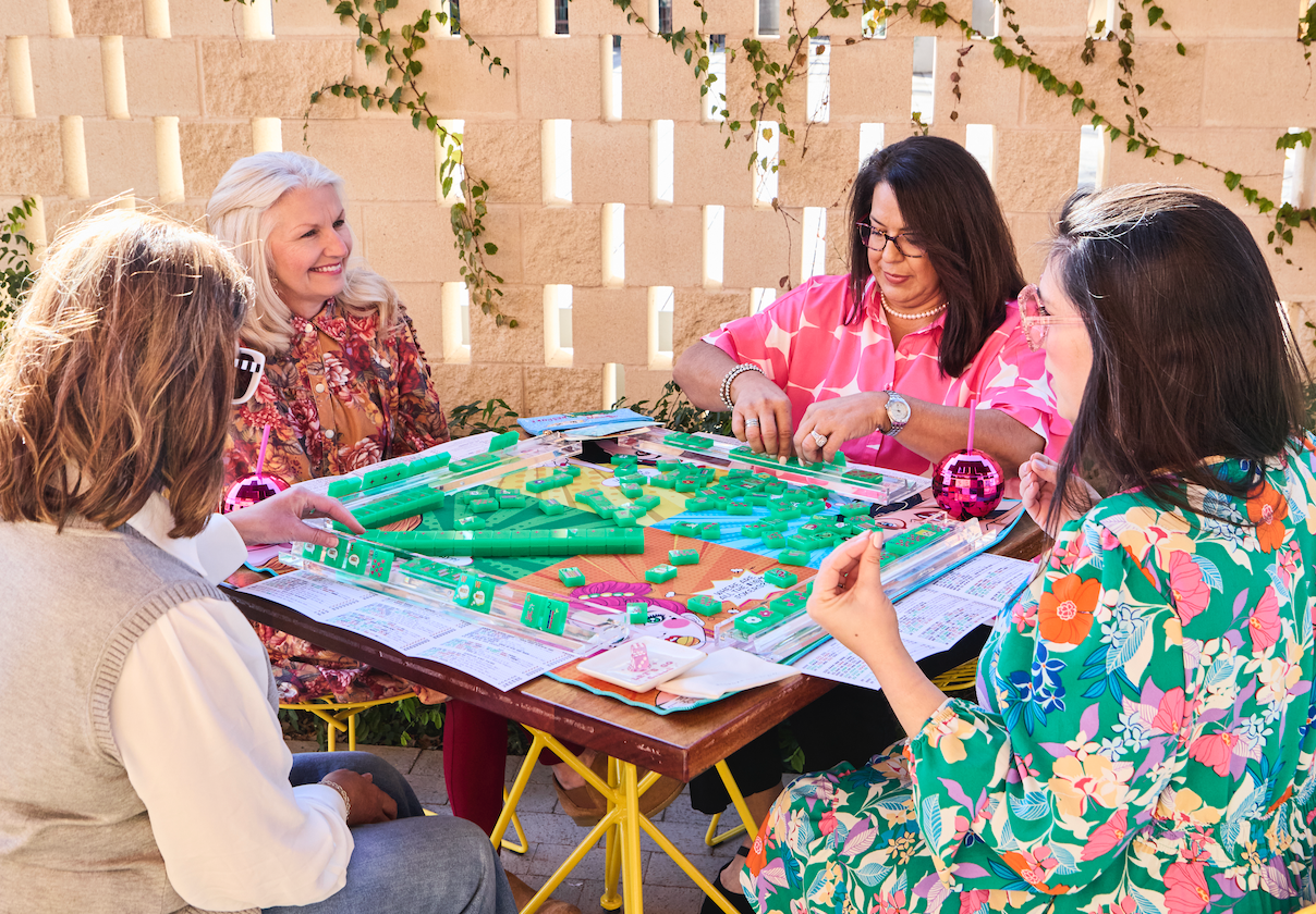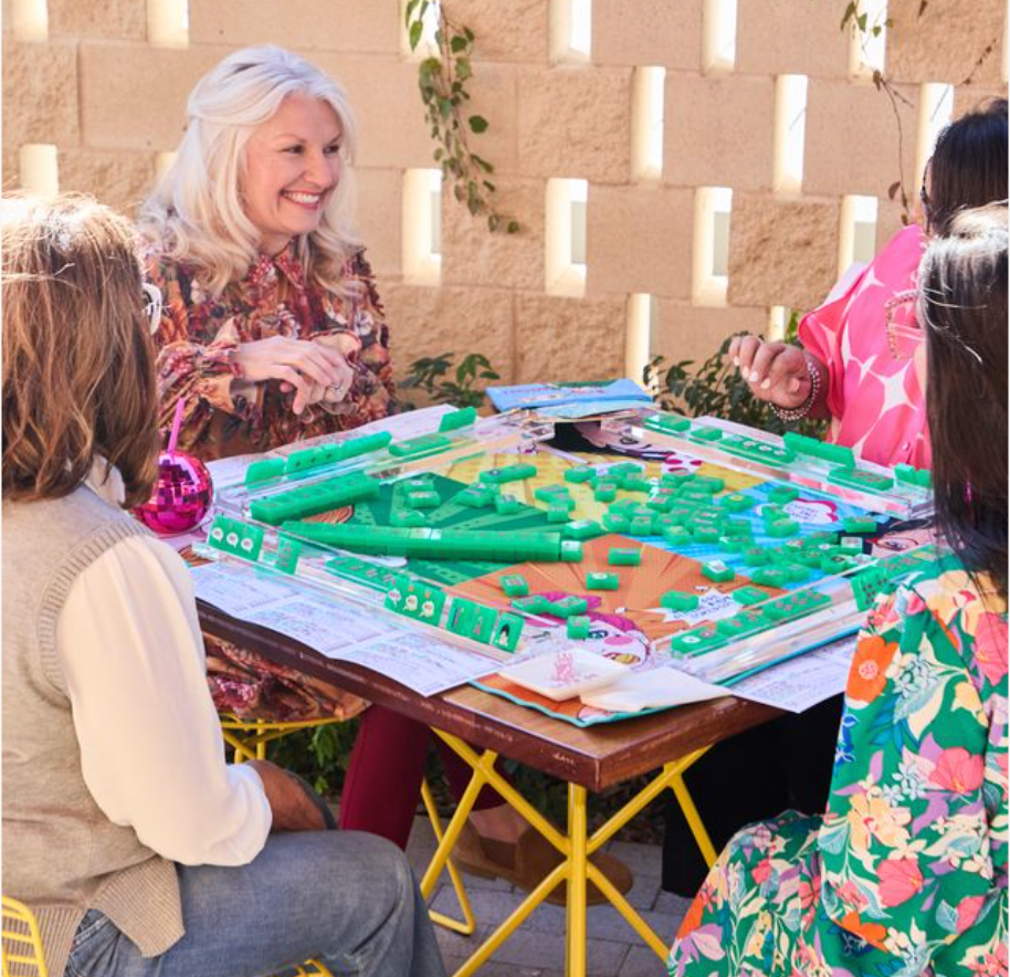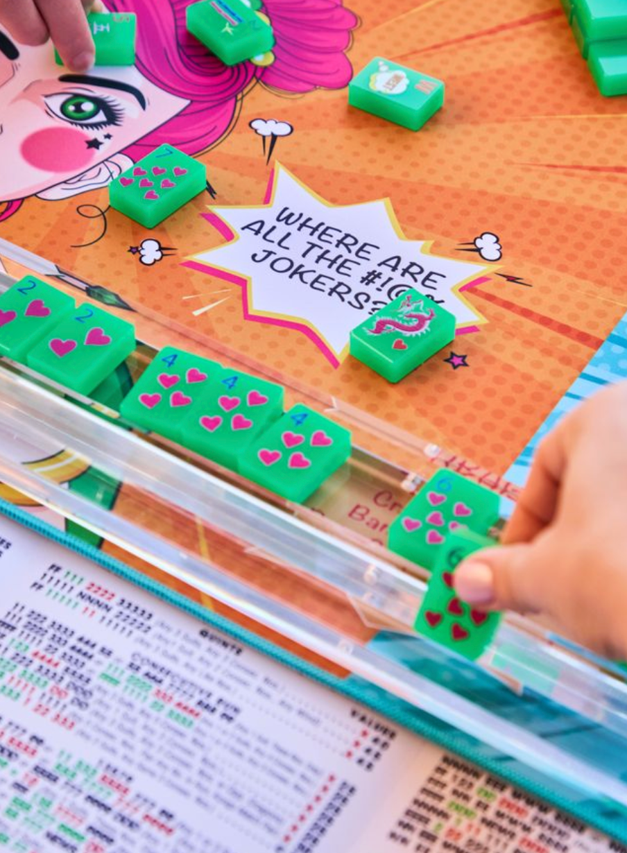 Elevate your gaming experience with The Bespoke Pop Divas Kit in DISCO GREEN tiles. This bundle of goodies includes tiles, racks, game mat, tile bag, dice, and The Patch Perfect Mat Sling Bag. Sure to make a perfect gift for any mahjong player!