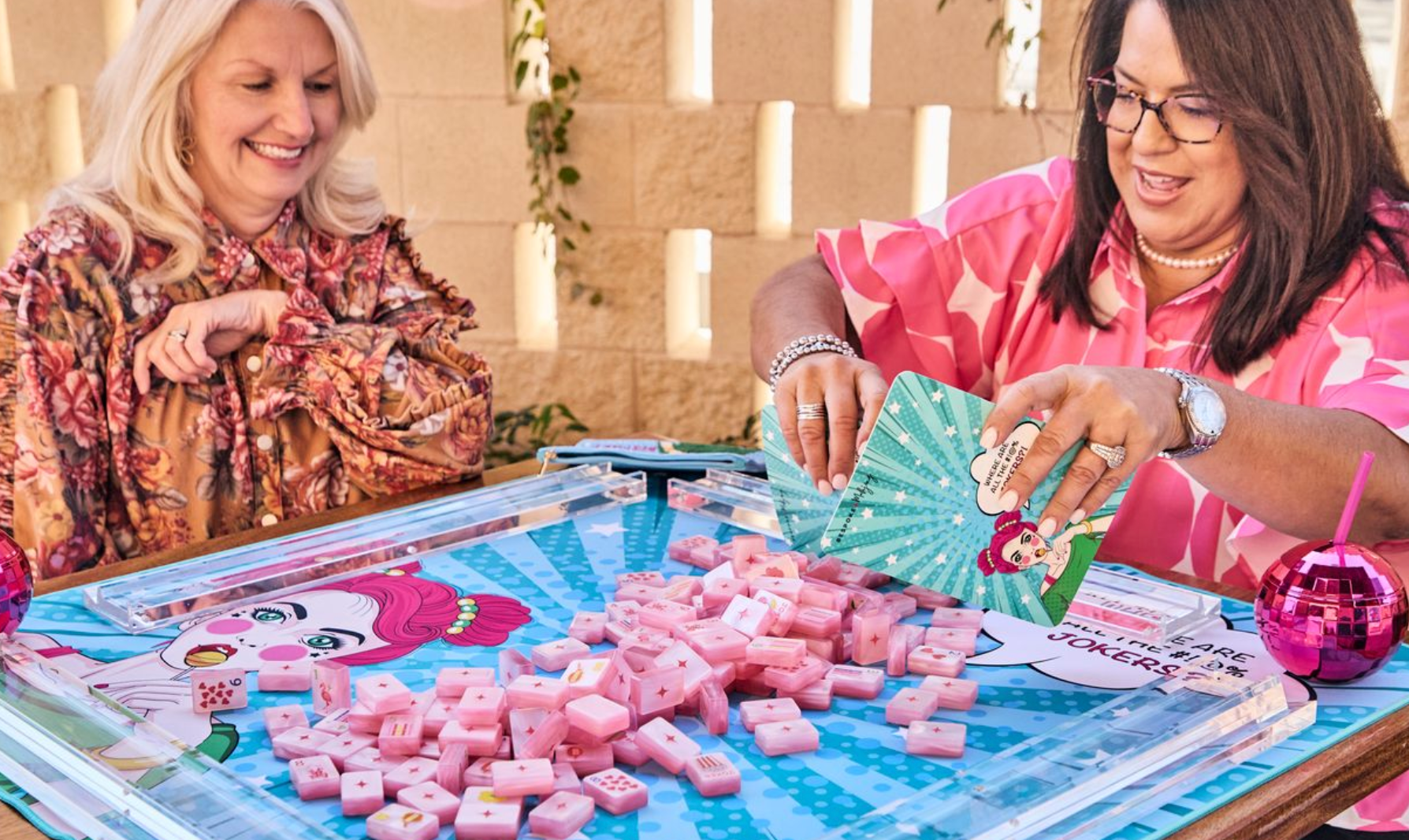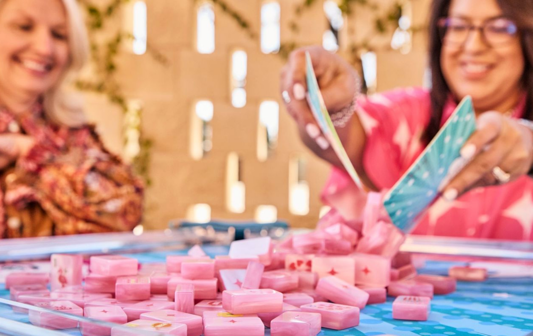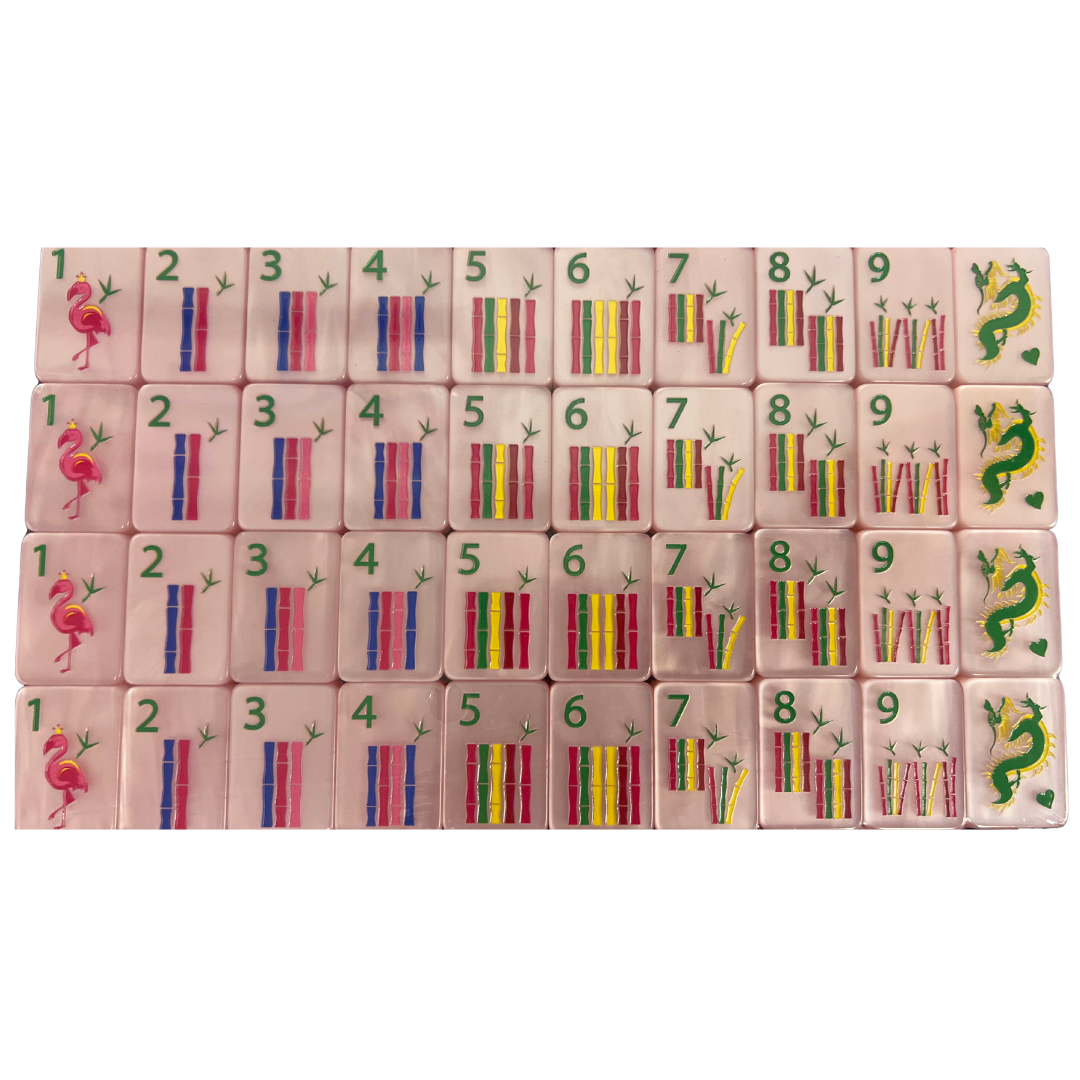 Elevate your gaming experience with The Bespoke Pop Divas Kit now in COTTON CANDY PINK PEARL tiles. This bundle of goodies includes tiles, racks, game mat, tile bag, dice, and The Patch Perfect Mat Sling Bag. Sure to make a perfect gift for any mahjong player!