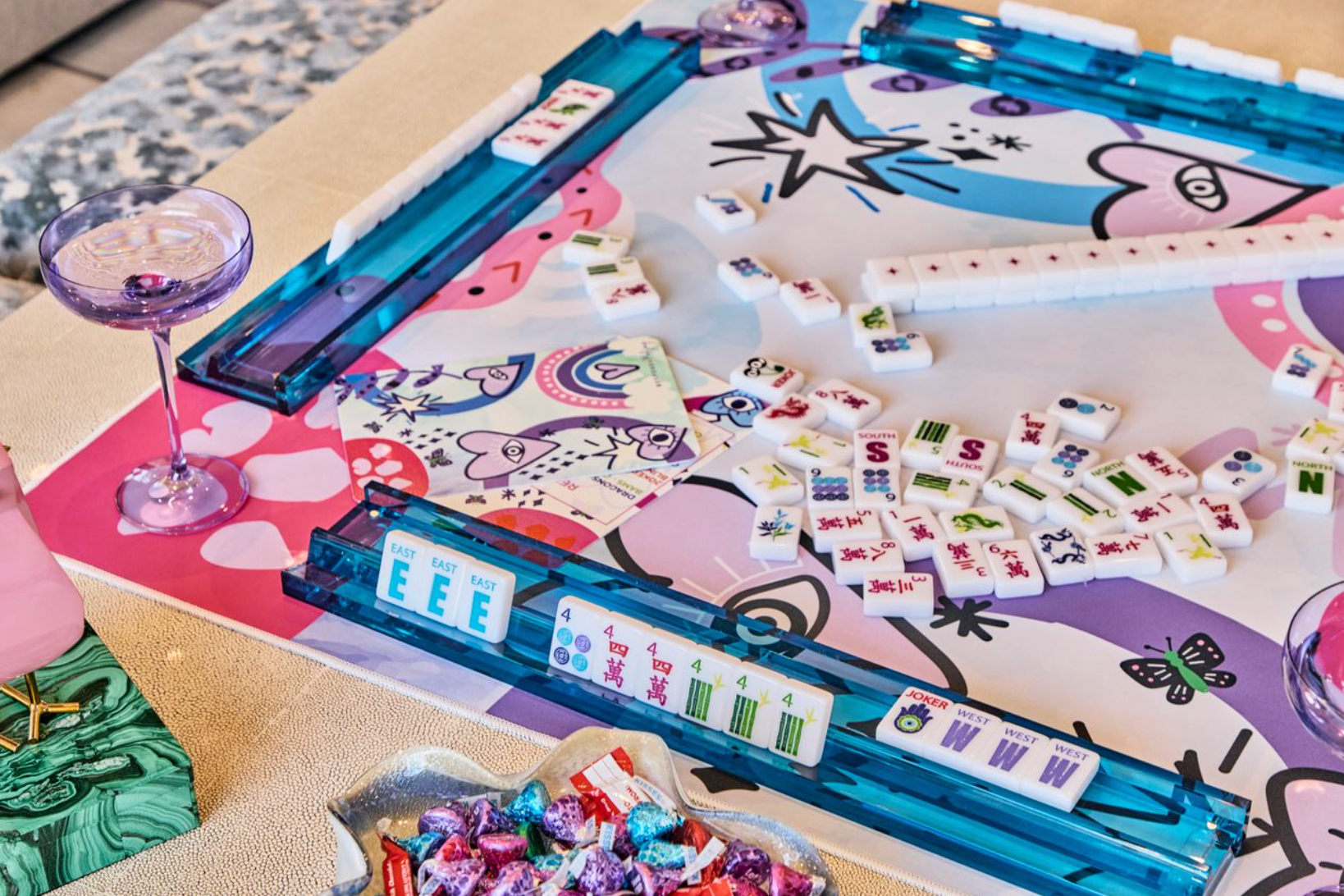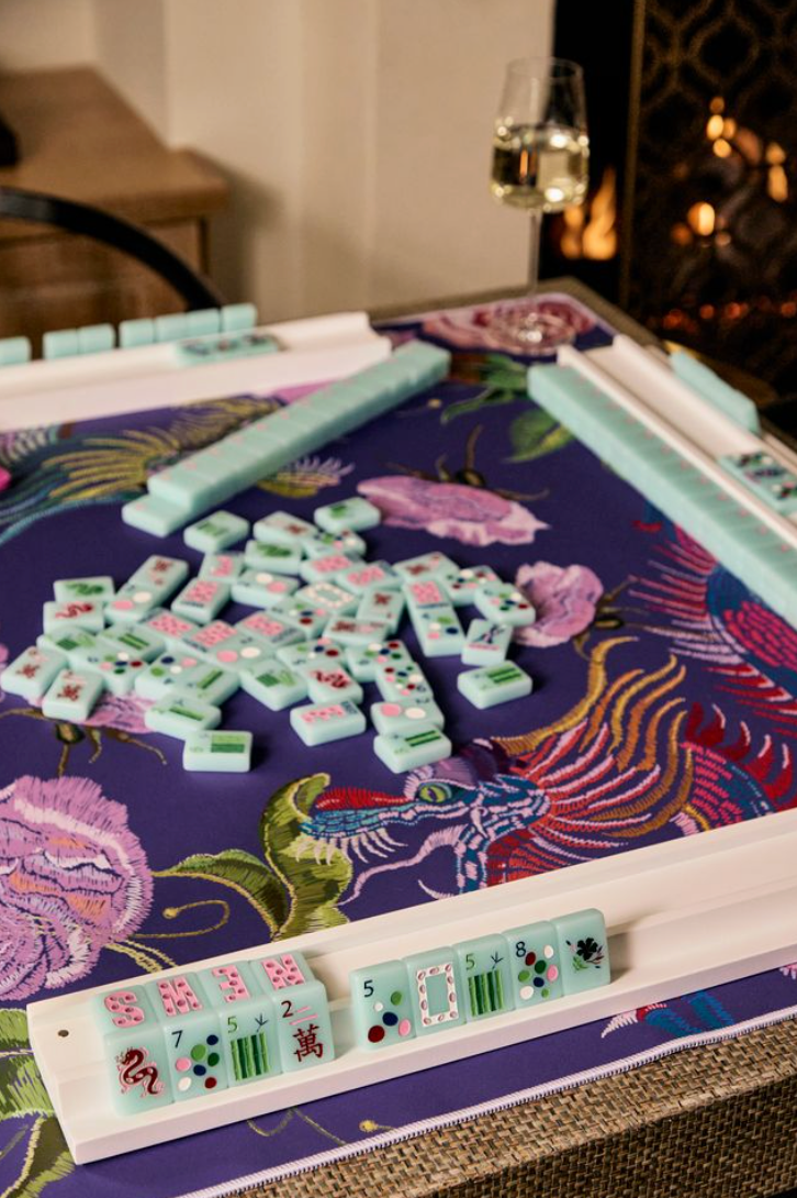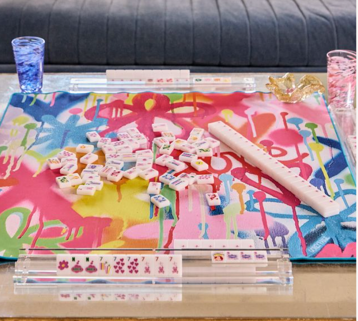 Bespoke Mahjong oversized canvas tile bag designed to match our Love Graffiti Game Mat but can be used to store any of your favorite XL Mega tiles. Includes a Bespoke Mahjong Puffy Heart Zipper Pull Keychain. Design is printed on each side of bag.